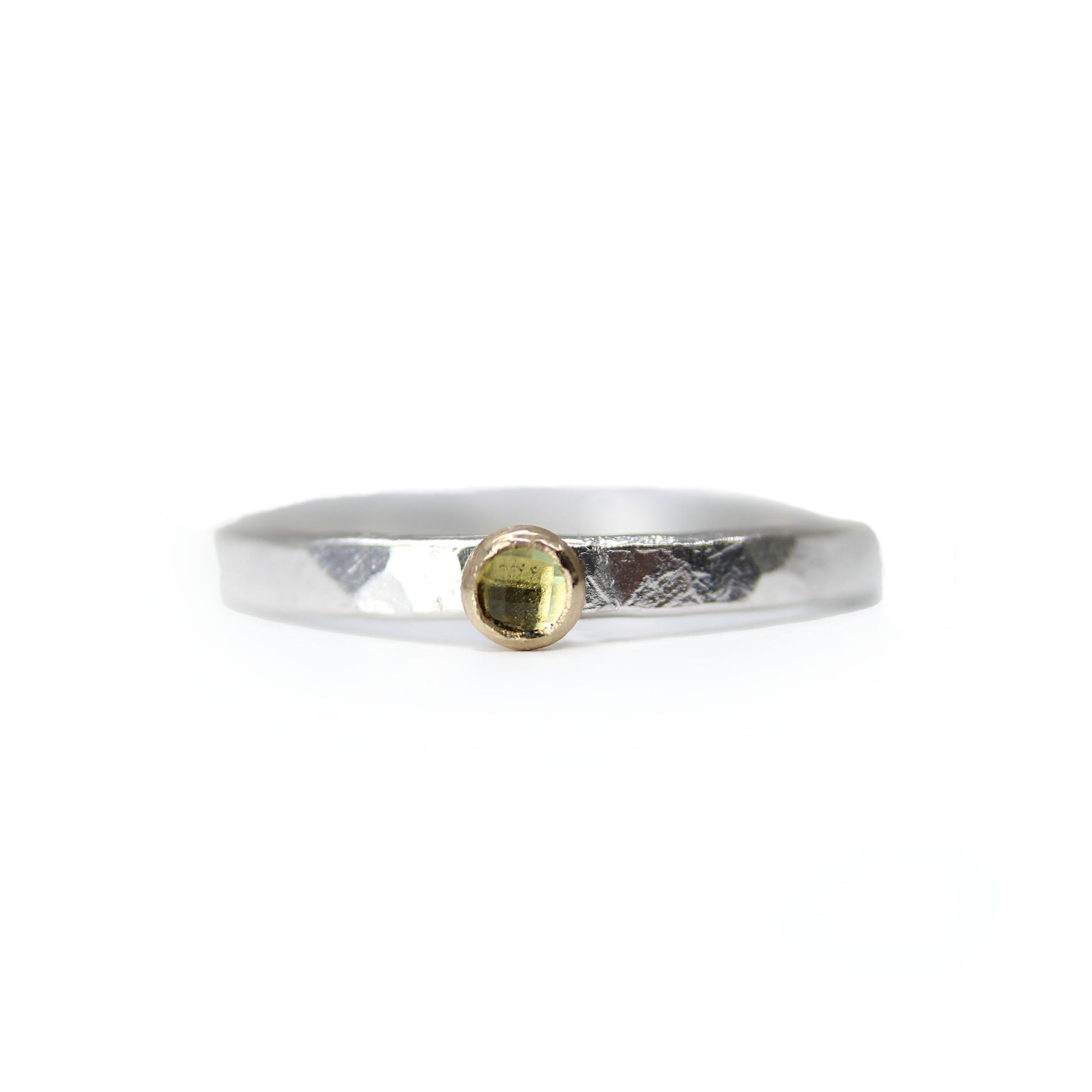 Recycled sterling silver and solid 14k bezel glimmer with a single, shimmering green, rose cut gem of fair trade Peridot. This stacks perfectly with all your other finger treasures, and one is rarely enough.