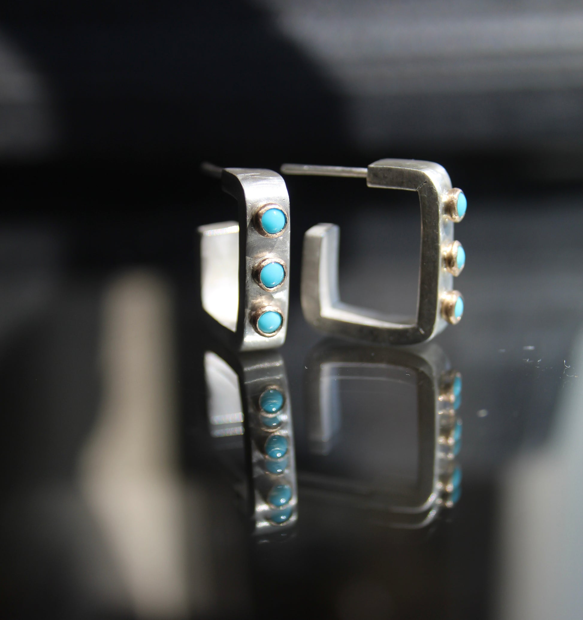 Hand fabricated in Los Angeles from recycled sterling silver, these decorative, geometric hoops are elegant and elevated, but versatile enough to wear with jeans and a t-shirt. Available in a large array of fully traceable, responsibly sourced gemstones- you are sure to find a color to suit your taste without compromising your values. This Item is handmade and slight variations are to be expected and embraced. It is unsealed, and Is intended to have a living patina that will darken and change with age.
