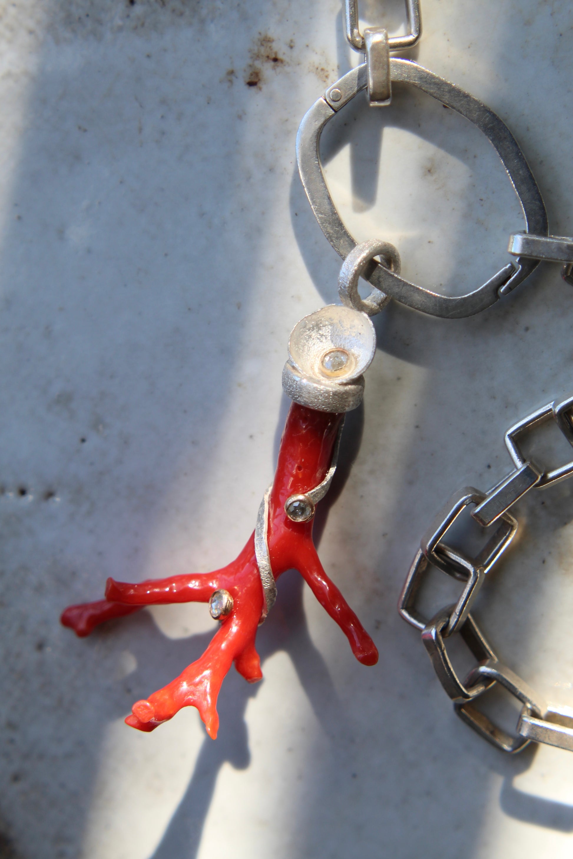 This natural red mediterranean branch coral was sourced from an estate and has been set in a completely hand-fabricated (not cast) sterling silver setting with solid 14k bezels. Featuring three rose cut salt & pepper diamonds- two set at the end of tendril-like prongs, and one cuddled into a shallow concave nest- this pendant is shown here on our signature link chain but could just as easily be worn with a simple thick snake chain or even leather cord.